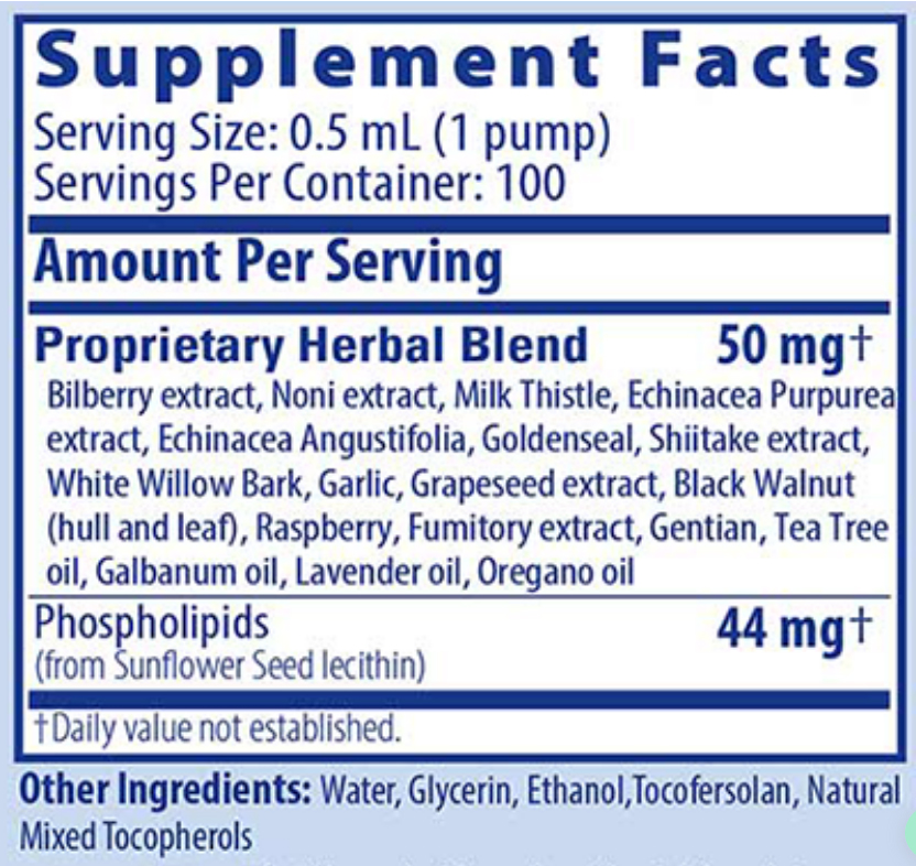 - Same base formula as Biocidin® liquid suspended in a unique sunflower phospholipid formula for intracellular delivery.