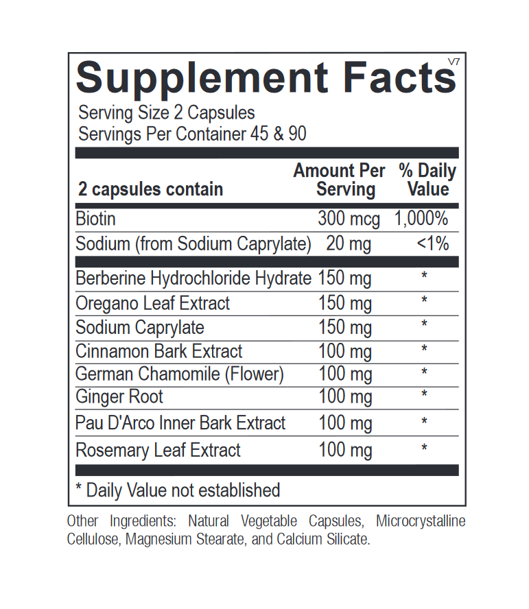 Dysfloracan provides a blend of nutrients, potent botanicals and essential oils to promote healthy microbial balance and immune support. Formulated with the goal of building a healthy gastrointestinal (GI) flora, Dysfloracan includes biotin, a nutrient that inhibits yeast from converting into the more aggressive fungal form. In addition, sodium caprylate is included to disrupt the metabolism of Candida and create a hostile environment for colonization. It also includes potent botanicals, such as berberine HCl, Pau d’Arco, oregano, rosemary, cinnamon and ginger, to sooth the GI tract, provide potent antioxidant support, and ensure microbial balance.