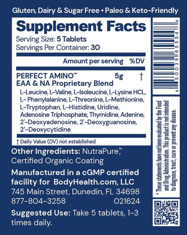 PerfectAmino® contains the eight essential amino acids the body needs to support and maintain its muscular, skeletal, enzymatic, and hormonal systems. The essential amino acids in PerfectAmino are in the exact proportions needed for maximum utilization by the body.